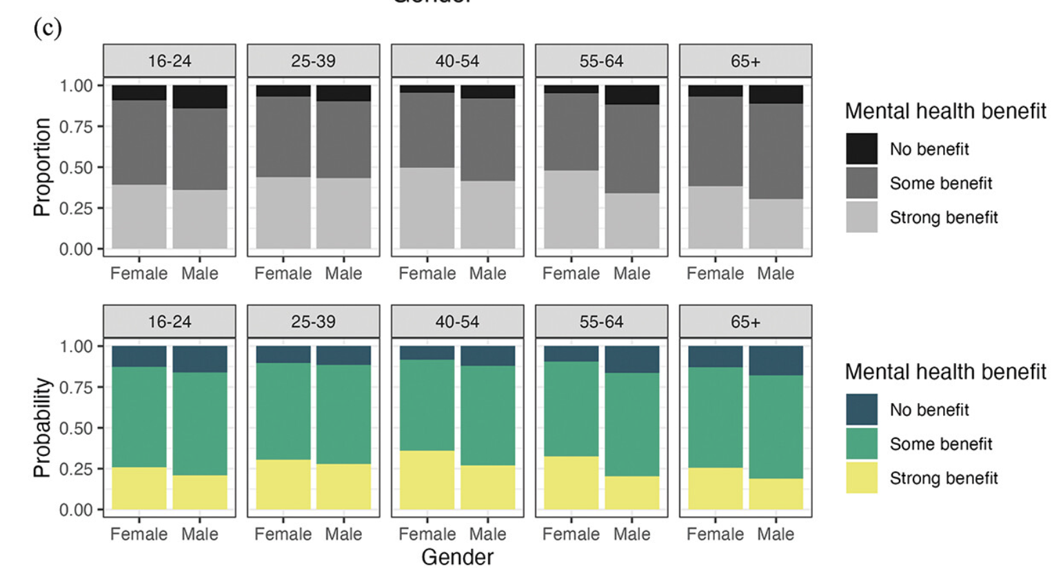 Women were 8.9% more likely to report a strong benefit of their visit when compared to men. The youngest age demographic, aged 16-25, reported the least mental health benefit of any age group