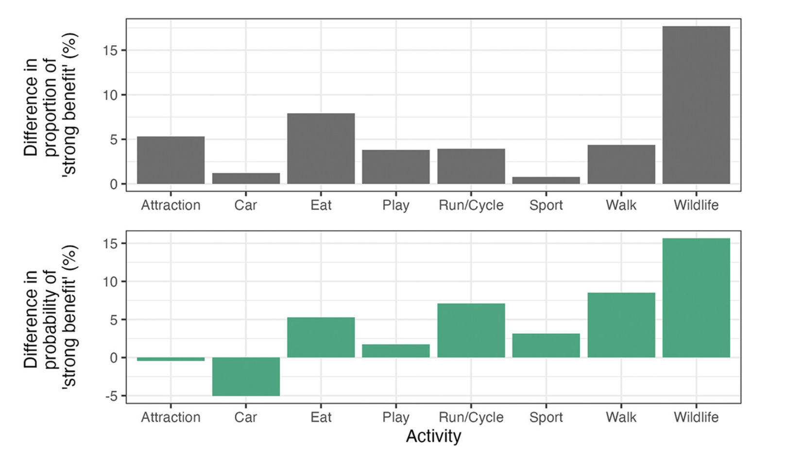 What you do in the park also matters: Those who spent time watching wildlife saw a 15.7% increase in the probability of ‘strong benefit’, with an increased benefit also linked to walking (+8.5%), running/cycling (+7.1%) and picnicking/eating (+5.3%).